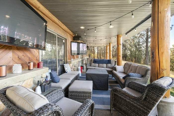 I have a friend who just bought a house. It is a big, sprawling e-state in the state of WashXington, including over 14,000 square feet of living space on a river. Here is a listing photo of the beautiful patio. If any picture is worth a thousand words, this is IT.